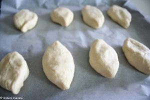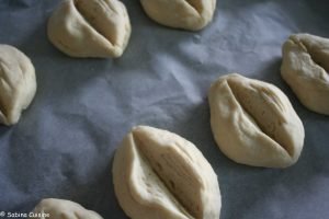 Podzielić ciasto na osiem kulek i pozostawić do wyrośnięcia na blasze, wyłożonej papierem do pieczenia na około 10 minut. Uformować bułeczki o podłużnym kształcie i pozostawić do wyrośnięcia na 30 minut. Wzdłuż każdej bułeczki zrobić na środku głębokie nacięcie. Ponownie pozostawić do wyrośnięcia na 10 minut.