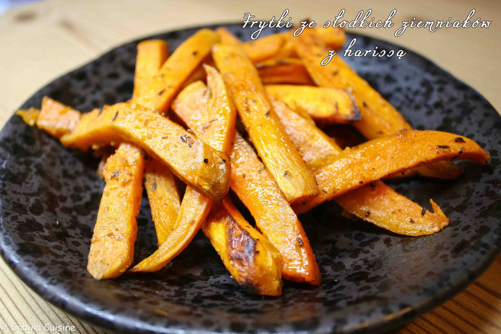 Pieczone słodkie ziemniaki, konsystencja przypominają mi nieco pieczoną dynię. Bardzo odległe w smaku od zwykłych ziemniaków. Smaczne ziołowe, lekko pikantne frytki najlepiej będą pasować do pieczonego mięsa.