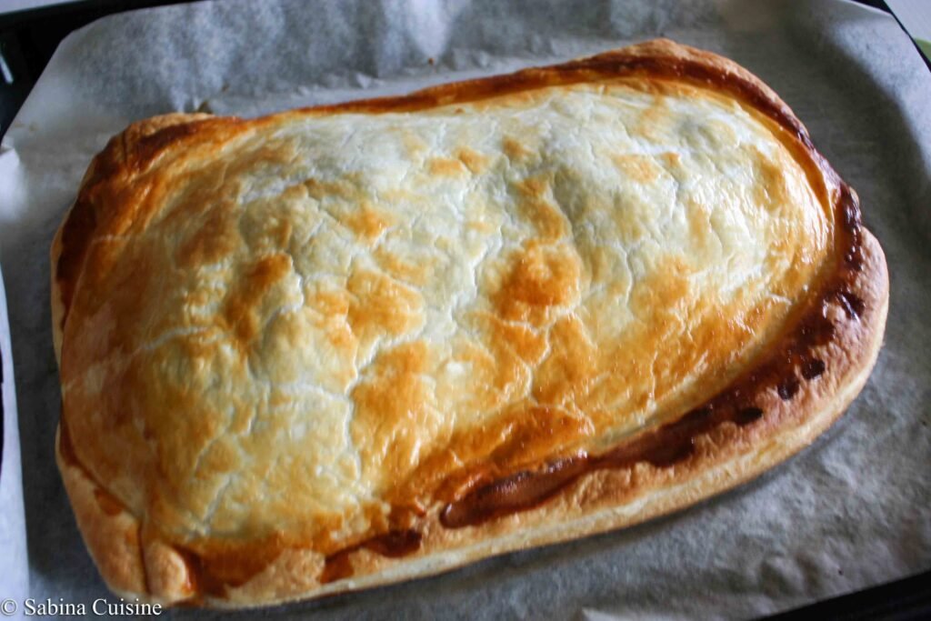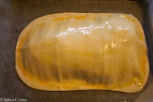 Resztki ciasta można użyć do dekoracji potrawy. Posmarować wierzch żółtkiem pozostawiając około 1 cm margines nieposmarowanego ciasta. Całość najlepiej odstawić w chłodne miejsce na 2 godziny (ja wstawiłam od razu do piekarnika nie schładzając).