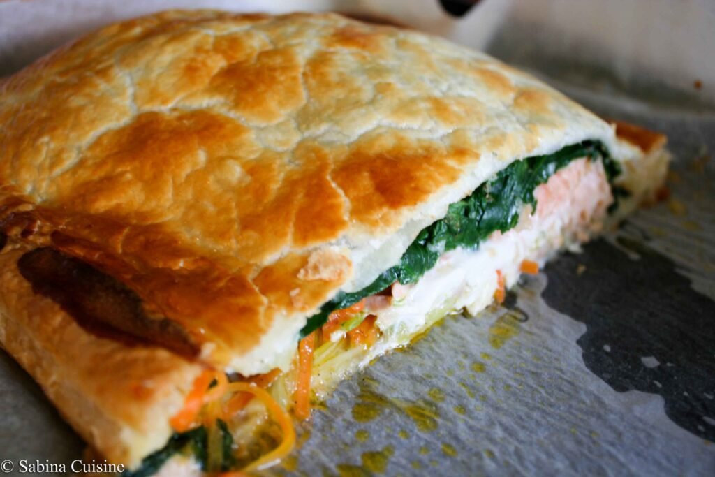 Dużą blachę do pieczenia (standardową, w wyposażeniu piekarnika) wyłożyć papierem do pieczenia. Położyć na niej jeden płat ciasta. Na środku ułożyć podłużny kopiec z warzyw o szerokości i długości nieco mniejszej niż filet.