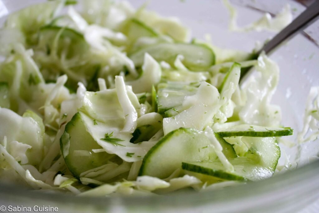 Jedną z takich surówek właśnie jest ta – z białej kapusty i ogórka, na którą trafiłam w jednej z rybnych knajpek w Polsce. Buszowałam jakiś czas w internecie i ją wreszcie znalazłam! Jest naprawdę pyszna!