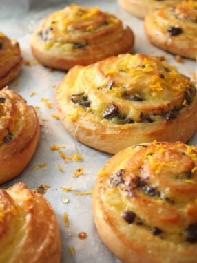 Przepyszne drożdżówki z kremem i kawałkami czekolady. Dodatek soku i skórki pomarańczowej świetnie łączy się z pozostałymi smakami. Przepis znalazłam w czasopiśmie „Fou de Patisserie”. Wymaga on trochę zachodu, tym bardziej że składniki są podane …